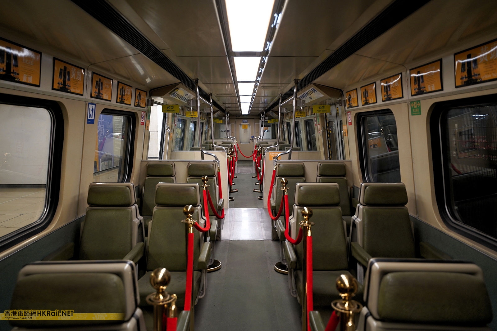 被保存下來的前九廣鐵路第一代電氣化列車 E44 頭等車廂內部,於紅磡站「站見」鐵路展前管制區內的五號月台展出