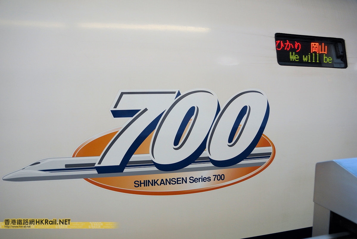 行走東海道新幹線ひかり481号前往岡山方向的JR西日本700系新幹線列車車外的目的地顯示牌及標誌