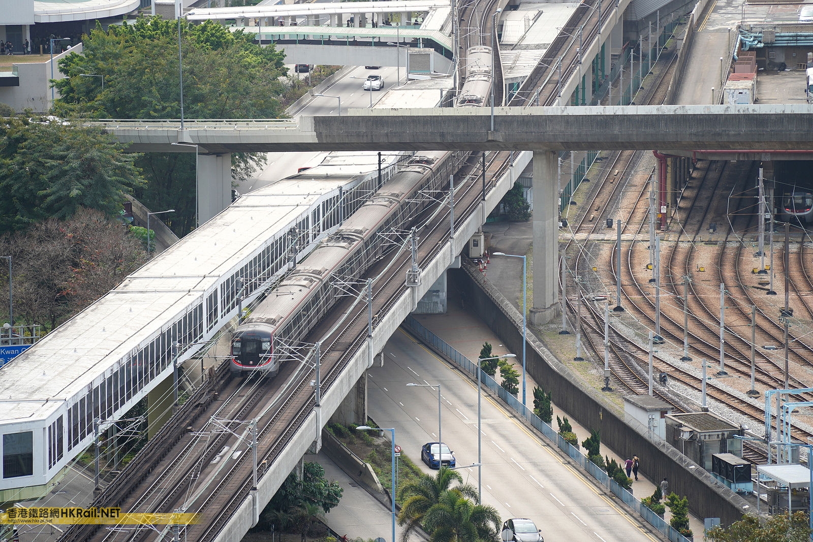 行走觀塘綫前往調景嶺方向的港鐵中國製Q-Train電動列車剛駛向九龍灣站
