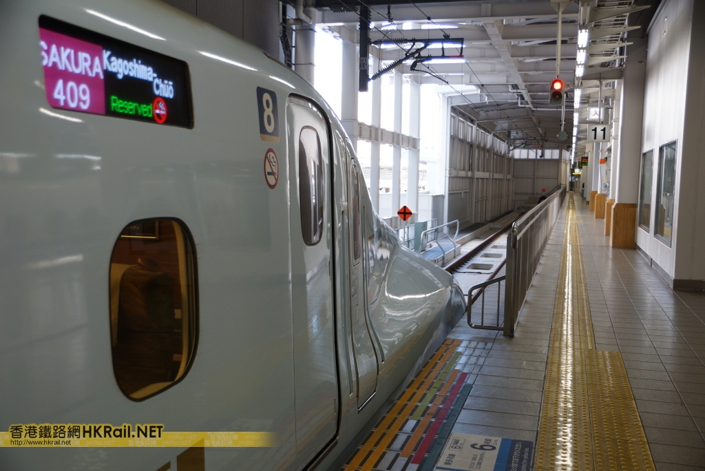行走九州新幹線さくら409号前往鹿児島的JR九州N700系新幹線列車(R9編成)正於博多駅11號月台等待出發