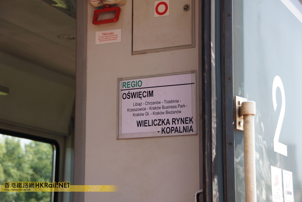 The route information as appear on the entrance of a Polish Przewozy Regionalne (Regional Transport) EN57 (EN57-2039rb) electric multiple unit as train R43411 for Wieliczka-Rynek